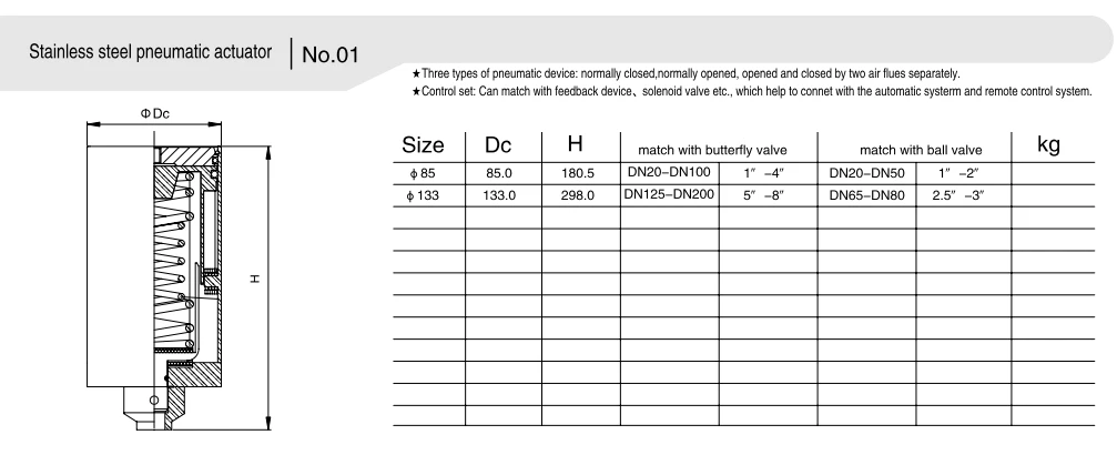 - Aktuator akting tunggal: Dilengkapi fungsi reset spring, kanthi otomatis bali menyang posisi asline nalika gagal pasokan udara, menehi proteksi safety sing dhuwur lan cocog kanggo skenario kanthi syarat safety sing dhuwur.